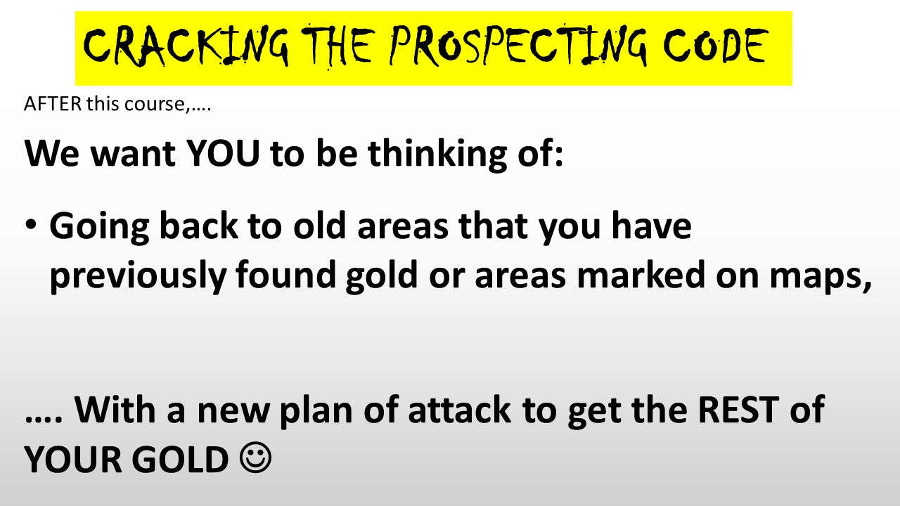 This is the training course that provides you with the knowledge to not just prospect using the advanced techniques, but to start to fully use the important FREE information that is available to you to show you where the thousands of gold bearing areas / patches are located and to help you start to identify NEW areas.