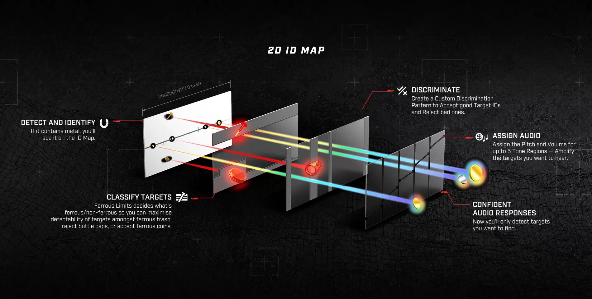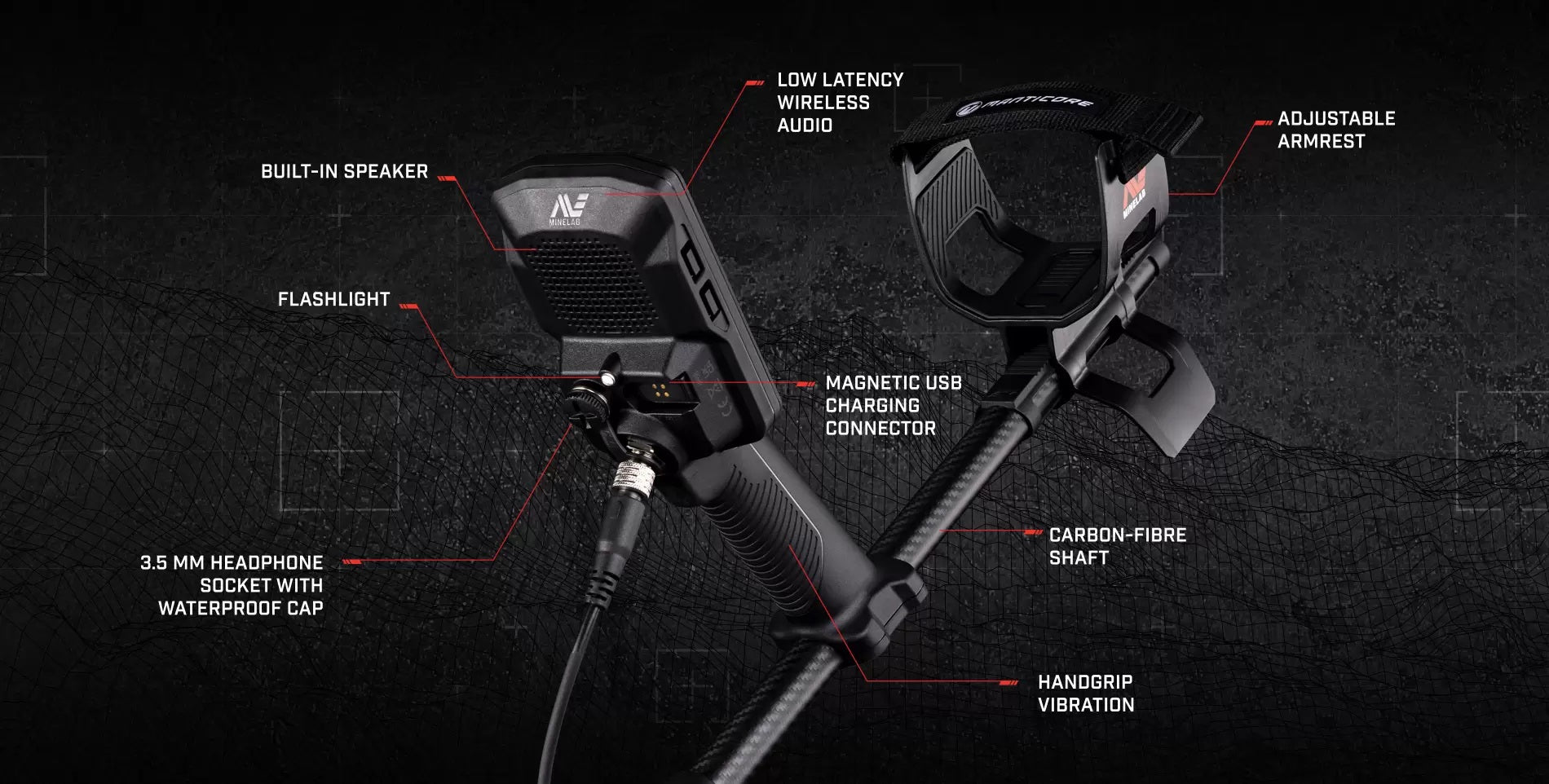 Take control of audio with MANTICORE. Hear target information the way you like it via superior audio controls including customisable target tones, suppression of Electromagnetic Interference (EMI) chatter and Continuous Pitch (VCO) audio with ferrous tones and genuine threshold detection tone.