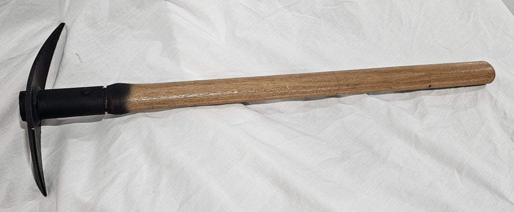 This is a heavy duty, durable pick that has a 60cm long wooden handle and a curved surface on the blade.